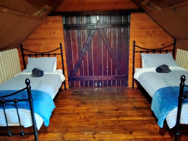 ⦁ 1 queen bed, 2 single beds and 1 sofa bed located upstairs in a shared open plan sleeping area.