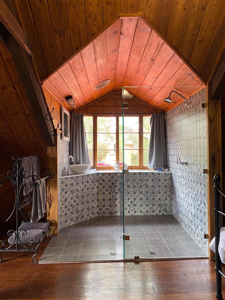 ⦁ One (1) queen bed located on the 1st floor with access only via a spiral staircase. Open plan living complete with bed and glass shower area overlooking the native gardens.